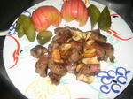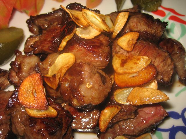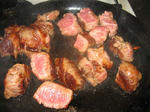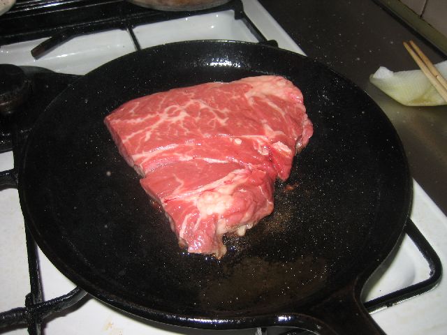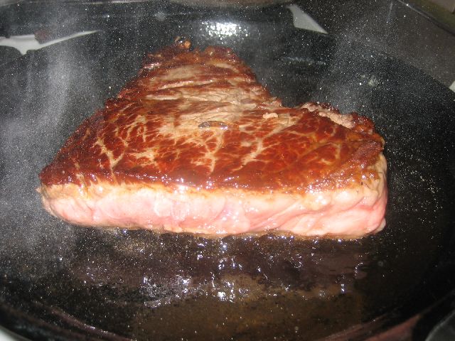 たまにはステーキを・・・厚切りビーフを厚板のフライパンでじっくりと焼きます。