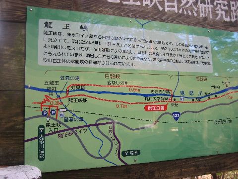 今回は龍王峡入り口から一つ上流のむささび橋までを左回りで歩きました。地図の赤いラインです。