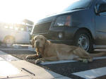 窮屈な車から解放されてのんびりと朝日に佇むレオ蔵君です。
