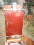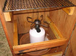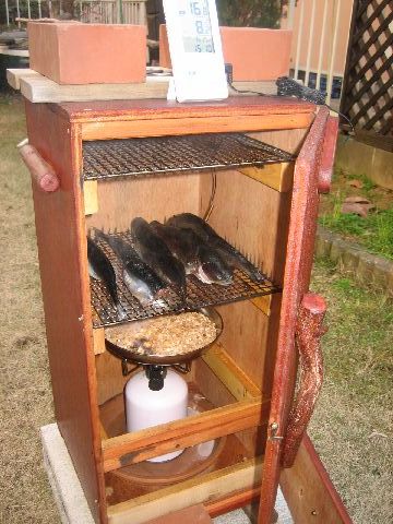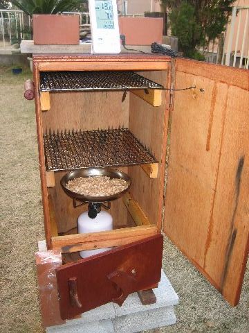 下の扉は開放します。庫内の温度が上昇するとバーナーの炎が大きくなりますのでこまめな管理を要します。スモーク温度は一気に70度くらいまで上がります。常にボンベの温度を手で確認します。