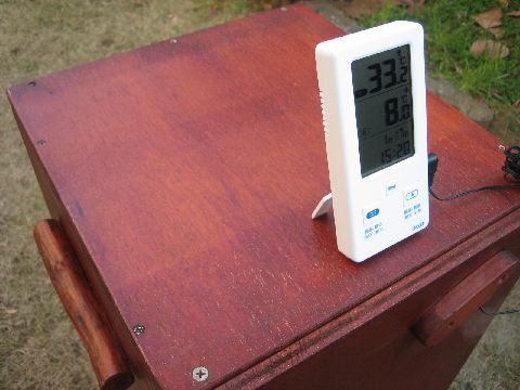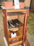 自作したスモーカーの防腐剤は柿渋を使用しました。日があたると色が変化することから板を二枚ひいて