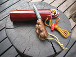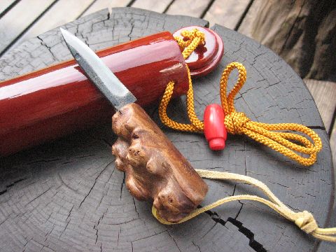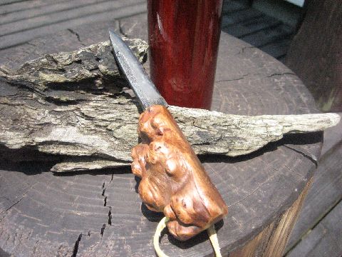 柄の部分は堅い木の瘤(こぶ)です。小さい握りは工夫がいっぱいです。握った時に落とさないように小指に掛ける革ひもさらにフィトするようにヤスリで握りの形に削り込みをしてあります。