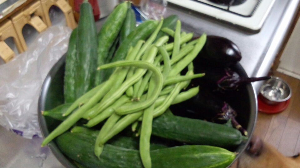 いんげん豆、きゅうり、ズッキーニ、なすといただいてきました。