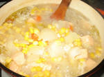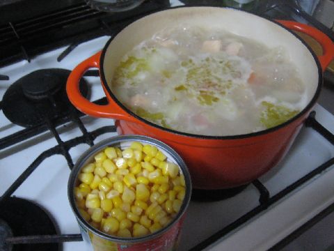 このときにサーモンとコーンを加えます。
