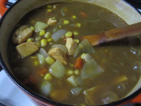じがいも、人参、たまねぎを適量炒めて水を加えて煮込みます。カレーのパッケージの裏にある作り方です。