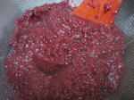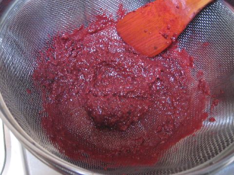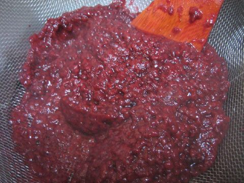 実が柔らかくなったらざるで種を丁寧に取り除きます。種は固いので食感は美味しくありません、ざるにあけてヘラでよく撫でてあげれば取り除けます。