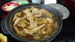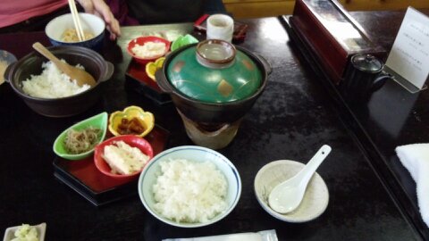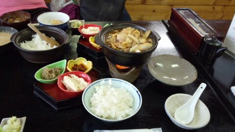 早速温泉入浴です。注文したメニューは豚鍋定食ととろろご飯定食