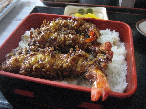 さらにエビ天もほどよく甘目のたれで美味しい。食べるのに夢中のスイッチオン!!!