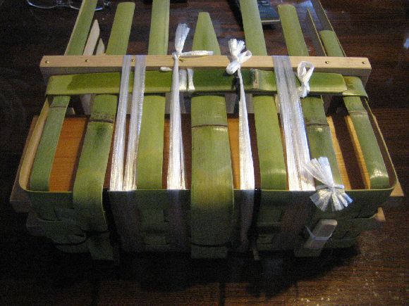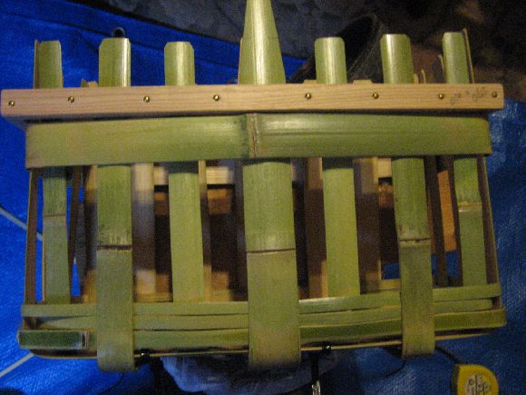 すごいですね、ここまでくればもう大丈夫です、上の方は比較的簡単です、下の角の部分が一番傷みやすいので銅板で保護すればさらに強度は増します、多分これで理屈は分かったと思いますので、この次は下の編み込みを省略した部分を如何に少なくするか、これに懲りず又暇が出来たら第2、第3とやって行けば素晴らしいものになりますよ。