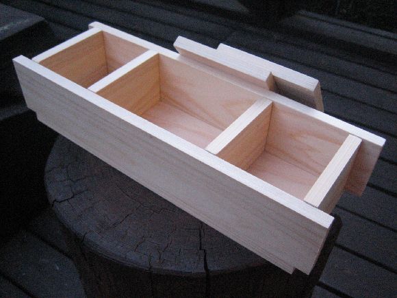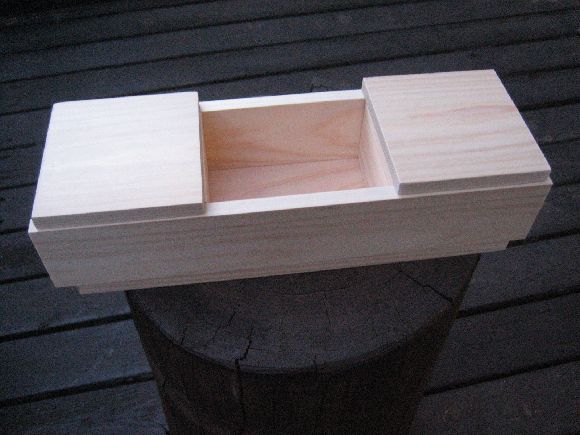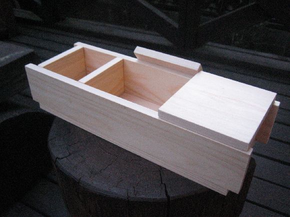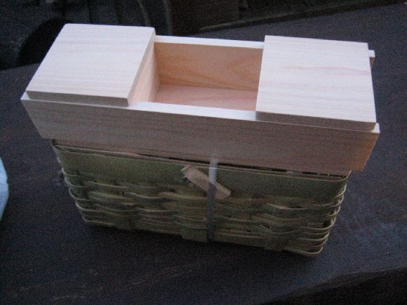 箱とビクとを金具で留めるなら良いのですが、箱の中にはめ込むなら3㎝位中に入るようにした方が良いかと思います、キツからずユルからず私は竹の首の部分を銅線で巻いたのを半田で止めていますが、その半田の厚みで調節しています、スッポ抜けて失くした事はありません、肩にかけるベルトもその役目をはたしています。