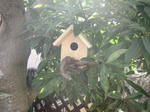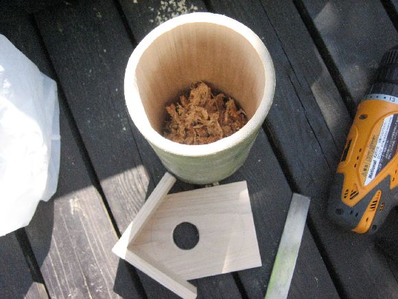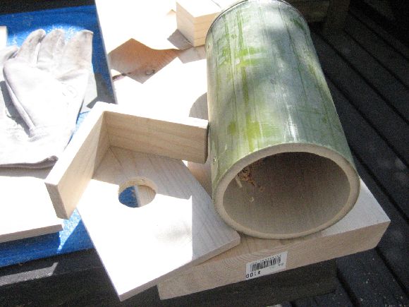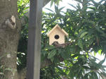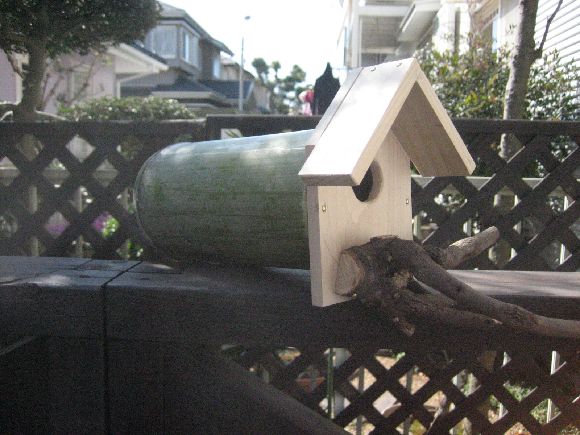 太い竹の半端が有ったので玄関を取り付けて水抜きとエアー抜きと止まり木を付けて庭木にセット