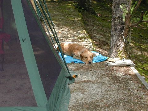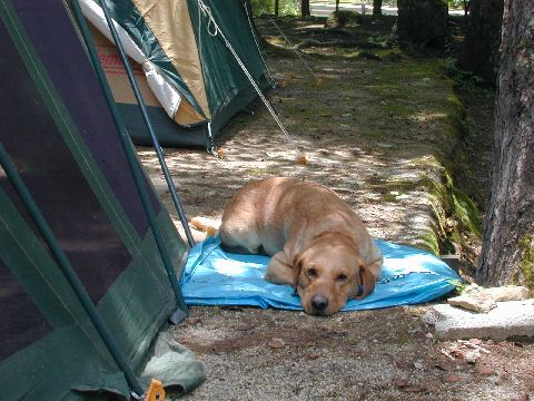 時折他のサイトの動きに一声吠えますが他は静かにテント回りを守っています。