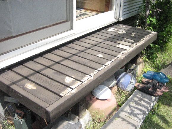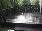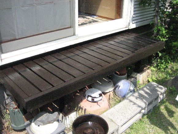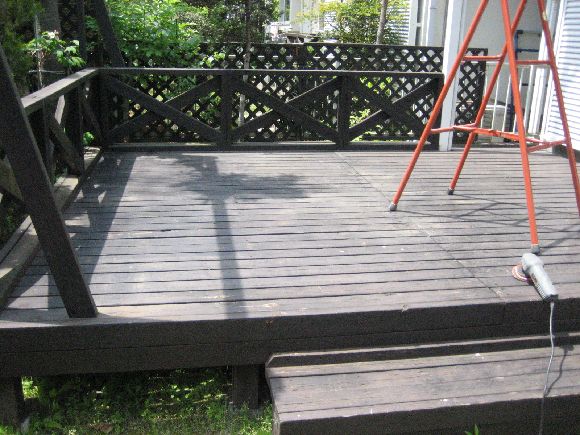 久しぶりなのでだいぶデッキと濡れ縁が傷んできてしまいました。このままだと腐りが始まってしまうので防腐剤を塗り直します。景気悪いので今回は安い防腐剤を試してみます。