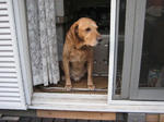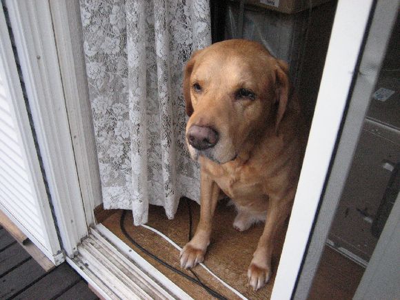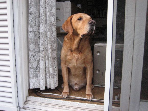 庭先で私のタモ作り作業を見ています。外には降りません。実に賢い相棒です。