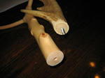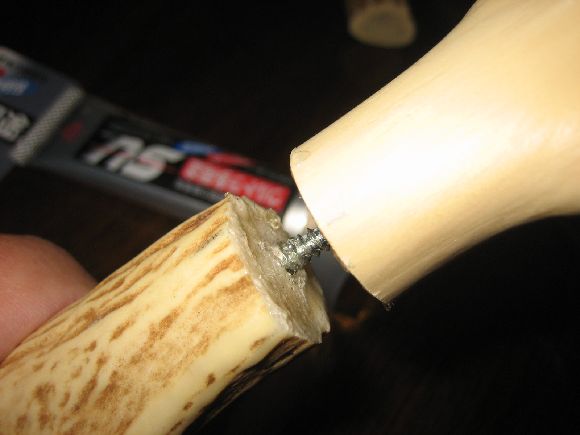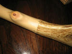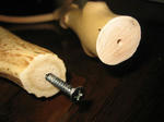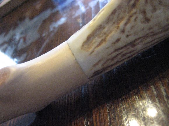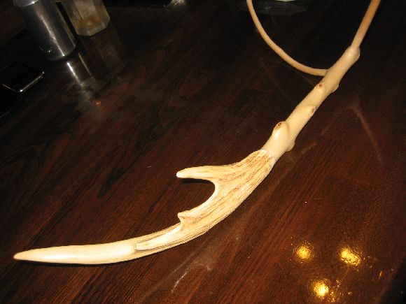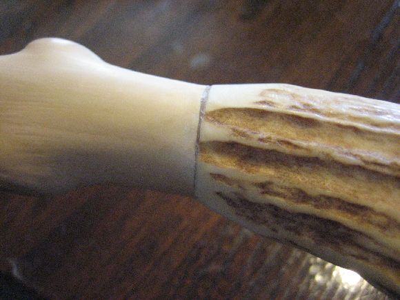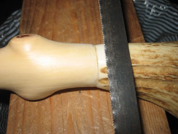 鹿角の取付はいったん仕上ったのですが柄の直線性が微妙に合わず気に食わないので再度切断して詰めて鹿角のつけ直しをしました。当初は使った接着剤が緩く外してつけ直しをしたら穴が有るにも関わらずズレが出て結果切りました。(^_^;)