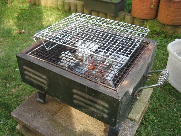 先日修理したバーナーで炭をおこします。住宅地なのであちこちに洗濯物が有り匂いがついてしまうのが心配なので短時間に火を安定させるのにバーナーは必要です。