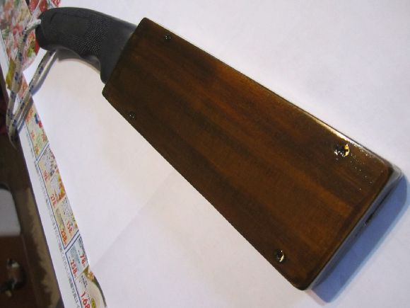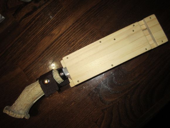見事な鞘ですね、下に水抜きの溝を彫ってある事なんかなかなか気の付かないところですが良いですね、柄が白すぎますが磨いたのでしょうか、自然のままが良かったかもしれません、黒系の塗料を薄く塗って素早く拭えば味が出るかもしれませんが、おやりになるなら切れ端で試してからにしてくださいね、私のは重過ぎて腰に負担がかかって困っています。