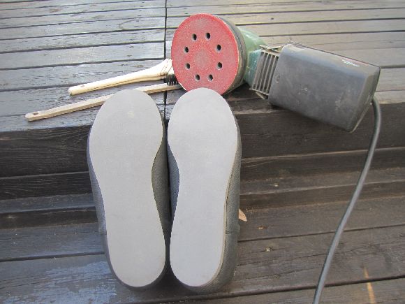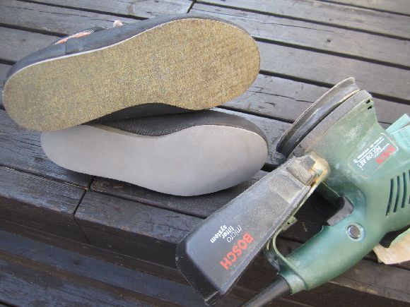 靴底の汚れや古いノリをヤスリデ落とします。電動で自分は行いましたが下地を薄くしないように汚れだけを取り除きます。ここでも削りすぎや変な傾きを作らないように気をつけます。