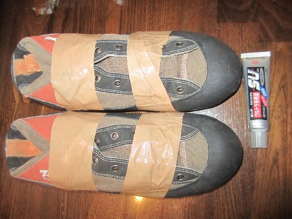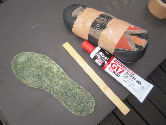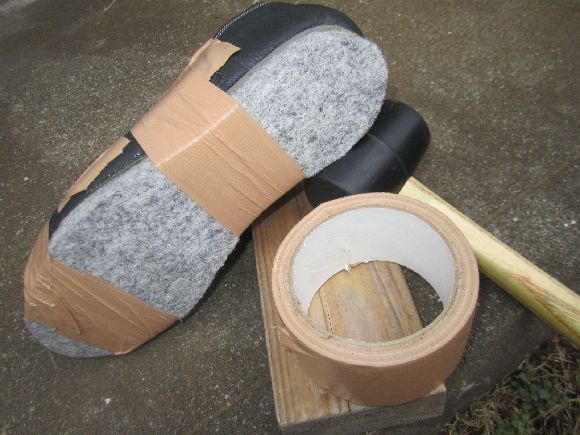 ブロ友のマンボウさんから助言を頂戴し靴の中にしっかりと新聞紙を詰めておきました。後に靴底を叩くときにとても良いです。ガムテープは上部にだけ貼り止めます。