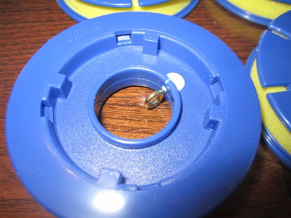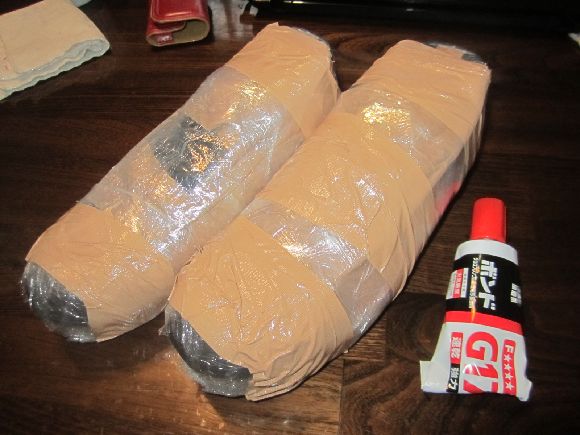 ここでもマンボウさんのアイディアで接着した後の押さえに結束用のビニールラップを使用しました。ここの作業で後に支障が出たのは真ん中の写真に有るようにフェルトにガムテープを貼ってしまったことです。なんと取る時にフェルトからテープが剥がれにくかったです。(笑)