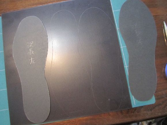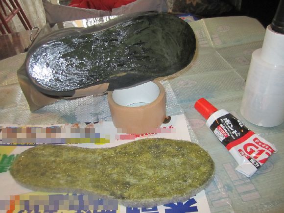 そして靴とフェルトの両方にへらで均一にのりを付けてまた10分ほど放置そしてずれないように張り合わせて加圧してゆきます。