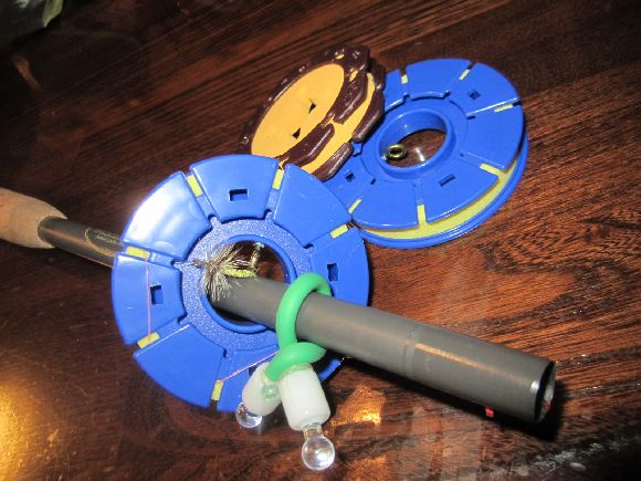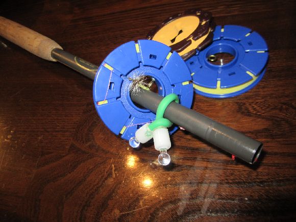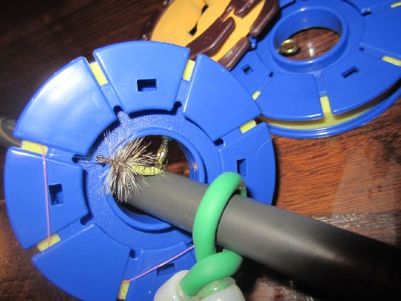 仕掛け巻きは毛鉤フックの外側に針先が向く方向で掛けて且つ中心の穴に竿を差し込んで必要でしたら手軽にバンドの小で巻いておけば確実。