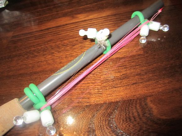 頻繁に仕掛けを収納を繰り返す場所は竿にバンド中2本とセンターにバンド小を3点に付ければラインを巻いては、伸ばしてはと繰り返すのような釣り場には楽です。テンカラUSAに紹介されていたものを手元の材料で作ったものです。道具が手作りで一段愛着が湧きます^^;